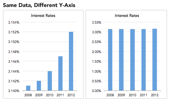 On the left, we’ve constrained the y-axis to range from 3.140% to 3.154%. Doing so makes it look like interest rates are skyrocketing! At a glance, the bar sizes imply that rates in 2012 are several times higher than those in 2008. But displaying the data with a zero-baseline y-axis tells a more accurate picture, where interest rates are staying static.